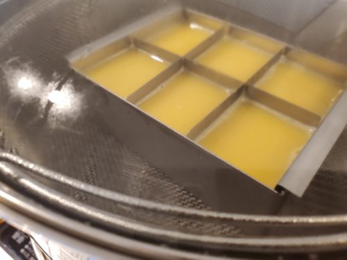 今回は豆腐と玉子豆腐を同時に調理することもあって、豆腐は鍋に蒸し台入れて沸騰しないように温度計を差し込んで温度をキープ、卵豆腐は低温スチーム調理鍋を使用しました。