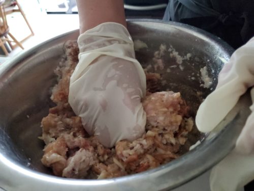 - 豚肉は50℃洗い後にフードプロセッサーにかけて粗ミンチにする。