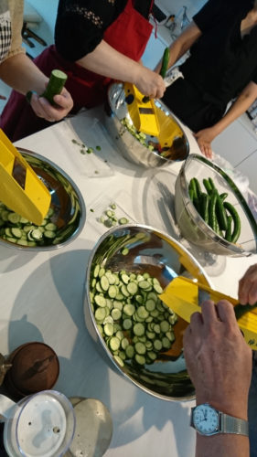 リズミカルに動く先生の手に合わせて、スライスされたキュウリがスッスッスとでてくる姿の美しいこと!!